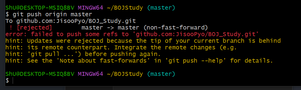 이런 에러가 떠서 hint를 자세히 읽어보니 non-fast-forward인데 pull 해오기전에 push를 해서 error가 난거 같았다. 근데 난 방금 Repo를 만들었는데..? 하고 Repo를 가보니 README가 있다. 원래 나는 Repo 만들 때 README 생성을 하지 않는데 취업에 중요한 거 같아서 오늘은 특별히 미리 만들어 볼까나~ 하고 만들어 둔 것인데 이것 때문에 push가 안된거라니..? 나중에 repo를 만들 때는 빼고 만들어야겠다.. 라고 생각하며 pull을 했다.