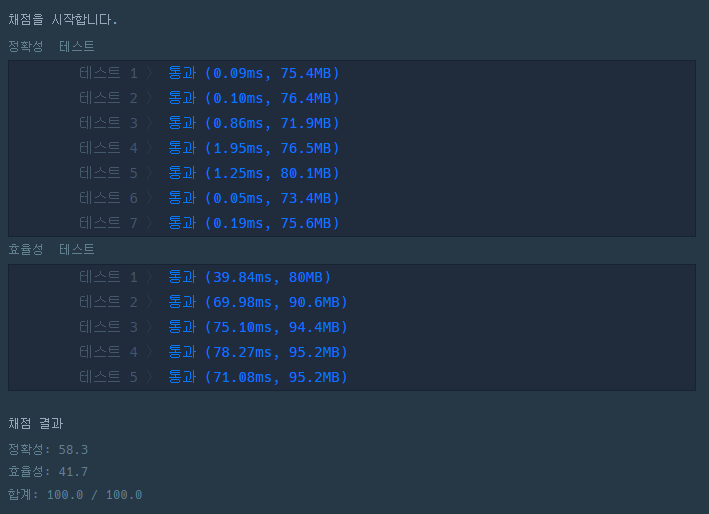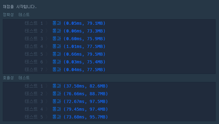 처음에는 List에 참여선수를 다 넣었다가 완주선수를 다 빼면 한 명 남으니까 그렇게 하면 되겠다고 생각했다. 정확성 테스트는 다 통과였는데 효율성 테스트에서 1, 2, 3, 4, 5번이 다 실패했다.