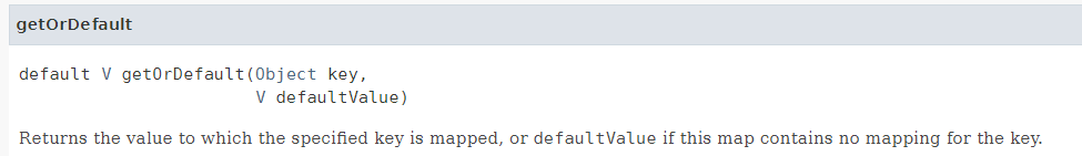key가 이미 매핑되어 있으면 value를 return해주고, 매핑되어 있지 않으면 defaultValue를 return해주는 메서드이다.