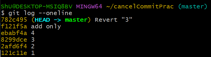 그러고 나서 log를 확인해보면 그 전 커밋 이력도 남아 있고, 새로운 revert "3"이라는 커밋도 생겼다. test.txt의 내용도 확인해보자.
