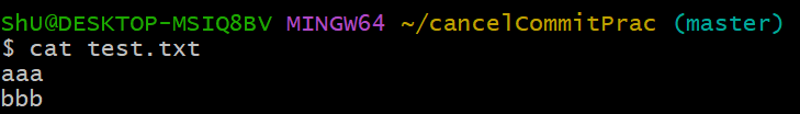 vi로 편집 상태로 들어가 충돌을 해결해 주었다. test.txt를 cat으로 확인해보면 aaa / bbb 로 입력이 되어 있다.