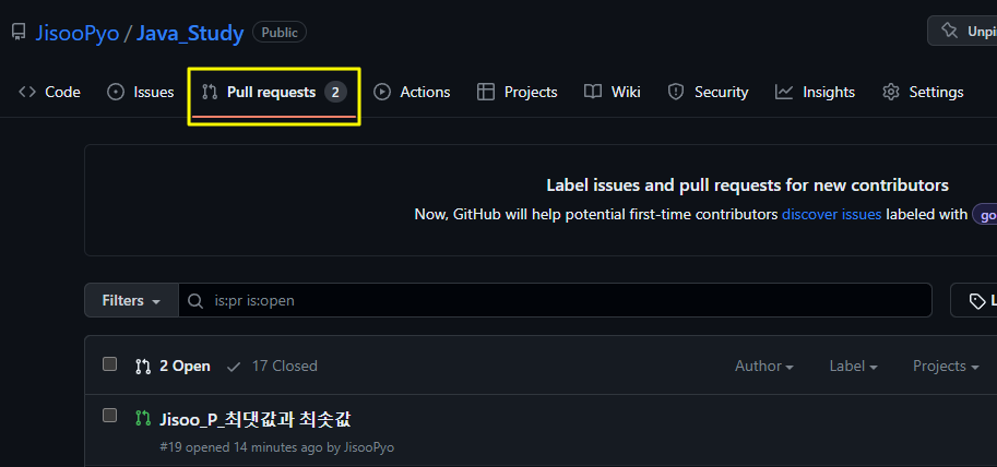 1. 자신이 포크해온 원래 레포지토리로 들어가서 pull request 탭으로 들어간다.