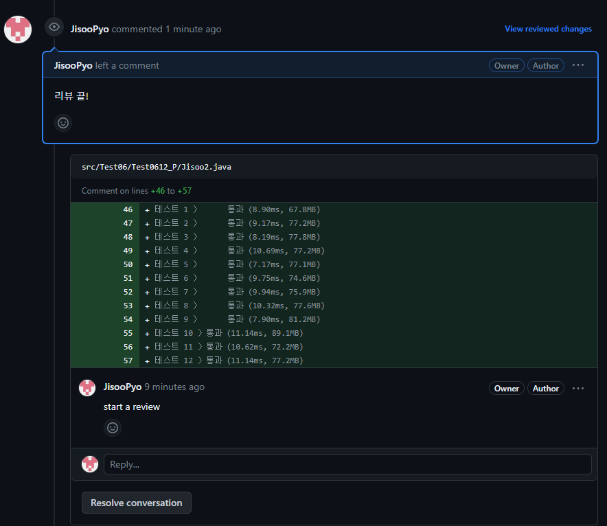 풀 리퀘스트의 conversation에서 확인할 수 있다. 현업에서는 이 부분 수정해 주세요. 하고 남길 수도 있다. 만약 그런 과정을 다 해결했다면 Resolve conversation 을 체크해서 처리가 완료됨을 표시해 주면 좋다. 우리는 코드 리뷰를 확인했다면 Resolve conversation을 체크해서 자기가 확인했음을 표시해 주면 좋을 것 같다.