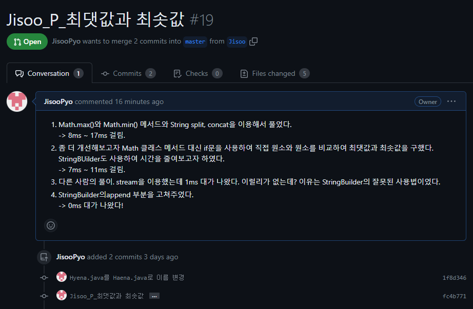 2. 코드 리뷰할 풀 리퀘스트로 들어가서 Conversation 탭에 있는 설명을 읽어보고 어떻게 문제를 풀었고, 코드를 썼는지 파악한다.